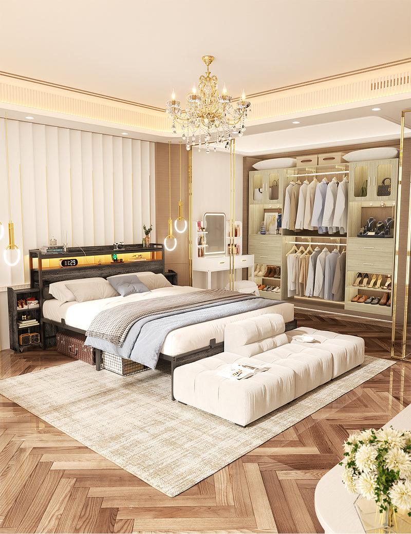 Queen Bed Frame with Upholstered Storage Headboard, Outlets, and LED Lights
