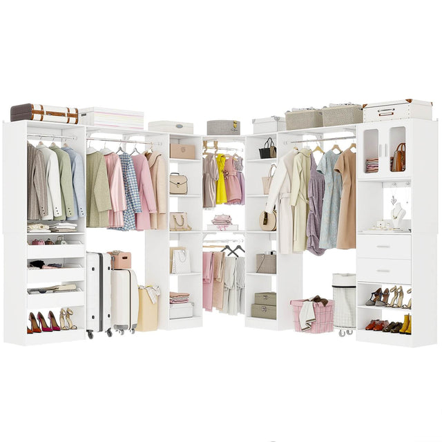 Unikito 3-in-1 Walk-in Closet System, Large L Shaped Heavy-duty Closet Organizer System with 5 Wooden Drawers and Hanging Rods.