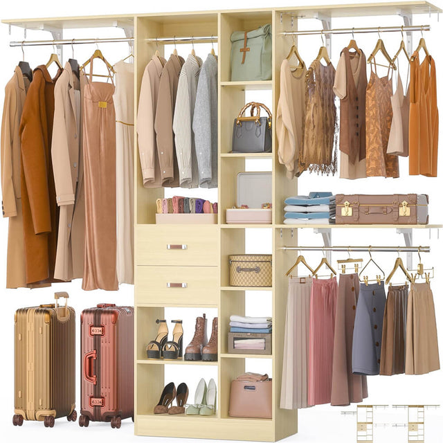 Unikito 8FT Wood Closet Organizer System with 13 Shelves & 4 Hanging Rods & 2 Wooden Drawers