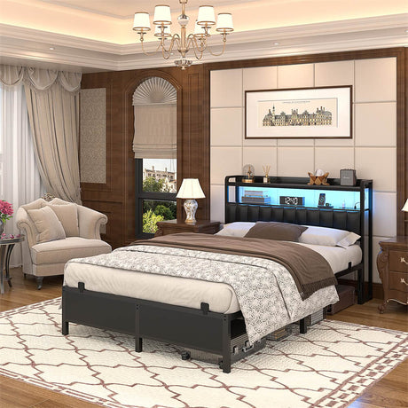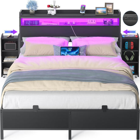 Full Size Bed Frame with Storage Headboard, Heavy Duty Bed Frame with Power Outlets and LED Light
