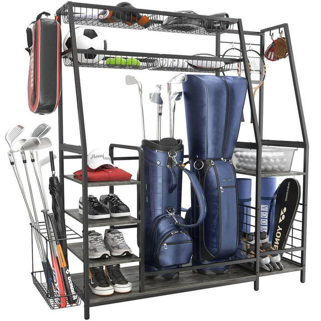 Capable of holding 2 standard size golf bags, the organizer also has 4 tier open shelves, 4 upper mesh basket, 4+2 removable hanging hooks, extended sport equipement area for all of your sport gear, including golf shoes, golf clubs, golf balls, and other golf accessory.