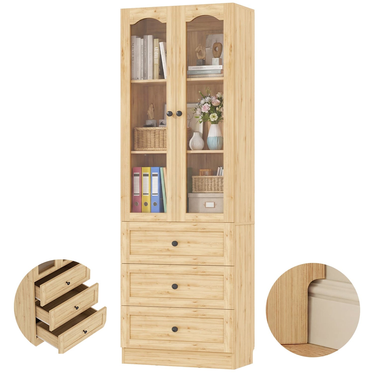 Featuring arched glass doors for a refined, upscale look. Inside, adjustable shelves provide flexible storage—perfect for tall bottles, dinnerware, books, or decorative pieces.