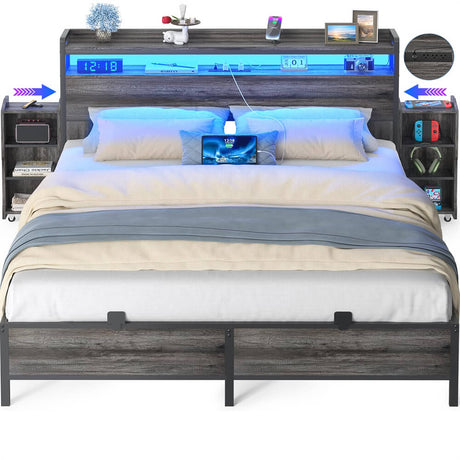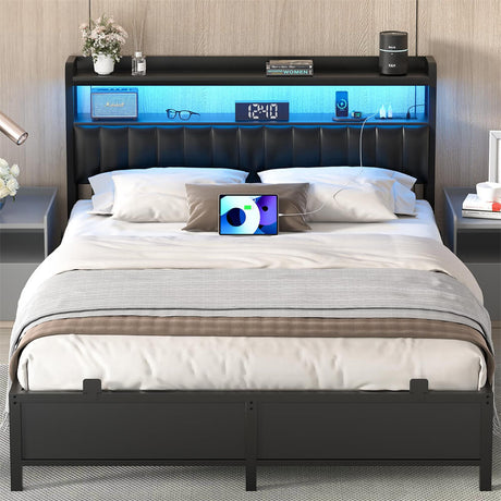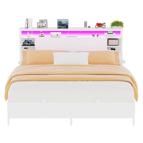 Queen Size Bed Frame with Storage Headboard, Power Outlets, and LED Lights, No Box Spring Needed