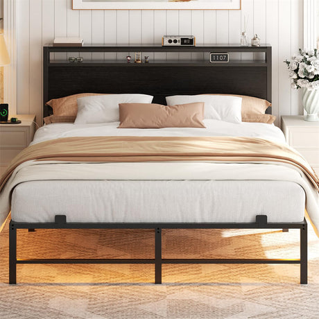 Queen Size Bed Frame with Headboard, Metal Platform Bed Frame with LED Light and Power Outlets