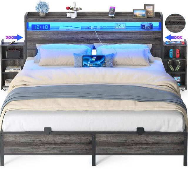 Unikito Queen Size Bed Frame with Bookcase Storage Headboard and LED Light, Queen Size Bed with Slide Bedside Cabinet and Charging Station, Heavy Duty Metal Slat, No Box Spring Needed, Noise Free