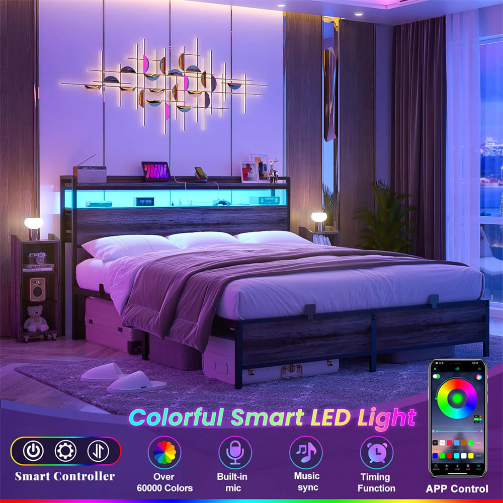 Unikito LED Bed Frame with Power Outlet and Slide Out Cabinet