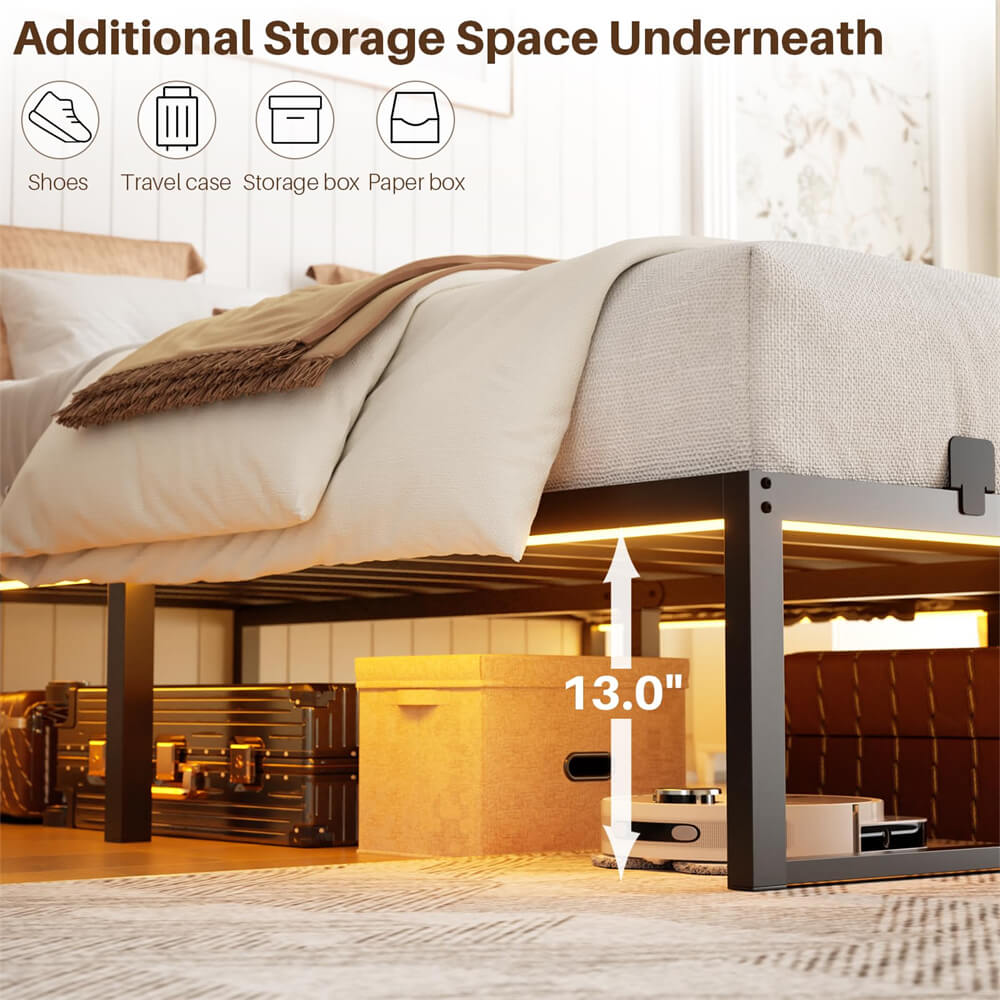Non-Slip Mattress Brackets & Extra Storage Space: The bed frame provides six removable metal brackets to prevent your mattress from slipping or moving. With a generous clearance of 13” underneath the bed, you can easily store clothes, bedding, or personal belongings.