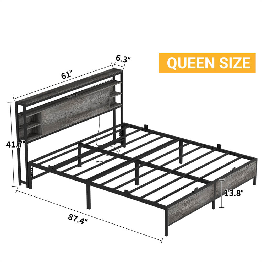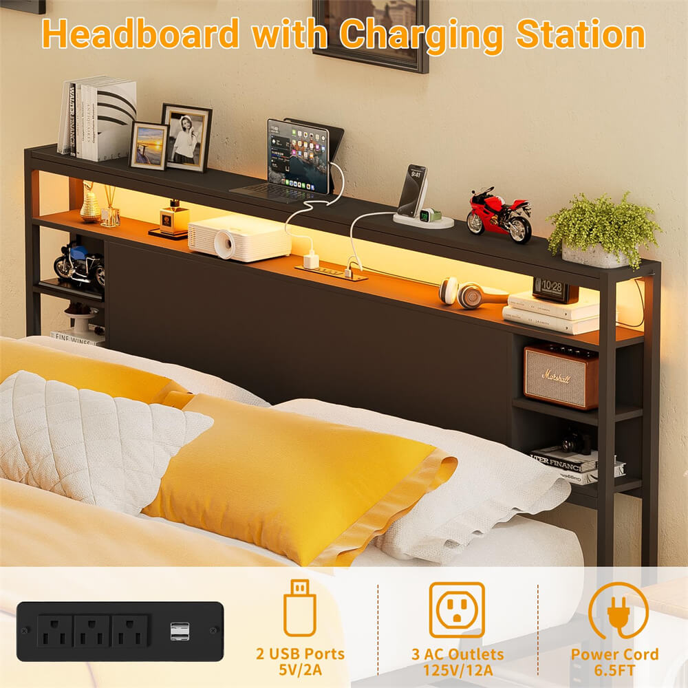 Queen Size Bed Frame with Storage Headboard, Power Outlets, and LED Lights, No Box Spring Needed