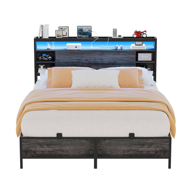 Twin Size Bed Frame with Storage Headboard, Platform Bed Frame with LED Lights and Power Outlets - Black Oak is backordered and will ship as soon as it is back in stock.